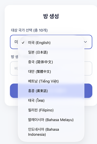 방을 생성한 뒤에 상대방 고객의 국가를 선택한후 방생성 을 누르게 됩니다.