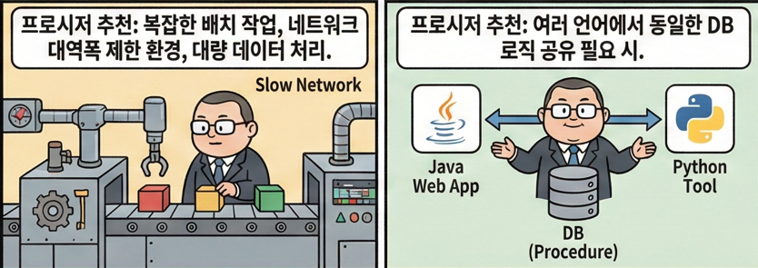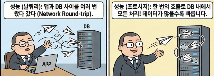 프로시저의 우위: 여러 개의 쿼리를 순차적으로 실행해야 할 때, 날쿼리는 앱과 DB 사이를 여러 번 왔다 갔다 해야 하지만(Network Round-trip), 프로시저는 한 번의 호출로 DB 안에서 모든 처리를 끝냅니다. 데이터 양이 많고 로직이 복잡할수록 프로시저가 빠릅니다.