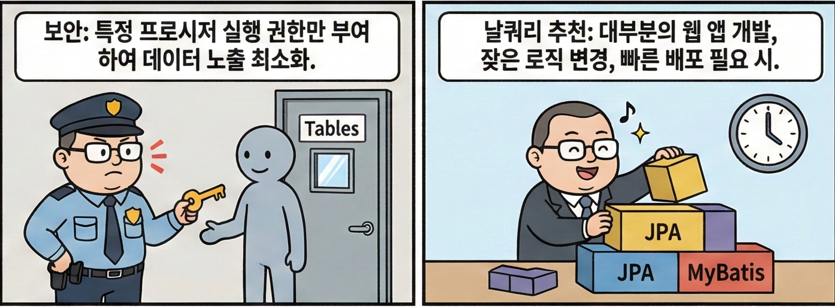 프로시저의 우위: 사용자에게 테이블 직접 조회 권한을 주지 않고, 특정 프로시저 실행 권한만 부여함으로써 데이터 노출을 최소화할 수 있습니다.