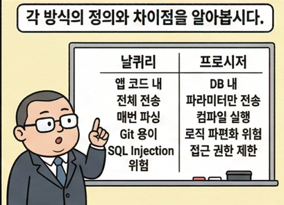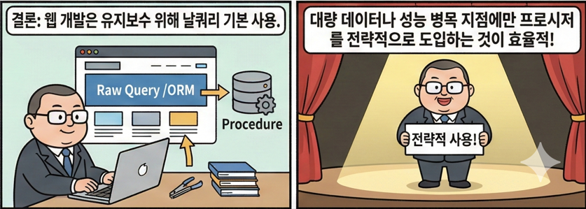 현대적인 웹 개발에서는 유지보수의 편의성을 위해 날쿼리(또는 ORM)를 기본으로 사용하되, 대량의 데이터 처리나 성능 병목이 발생하는 특정 지점에만 프로시저를 전략적으로 도입하는 것이 가장 효율적입니다.그럼 오늘도 모두 즐거운 DB작업 되세요.
