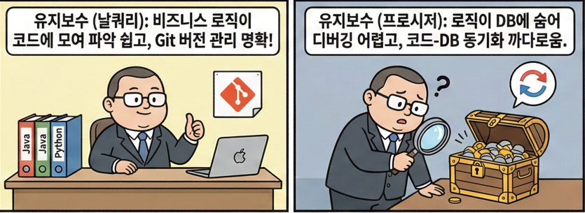 날쿼리의 우위: 비즈니스 로직이 코드(Java, Python 등)에 모여 있어 흐름 파악이 쉽고, Git을 통한 버전 관리가 명확합니다. 또한, DB를 다른 종류로 교체(예: MariaDB -> PostgreSQL)할 때 수정이 비교적 쉽습니다.
